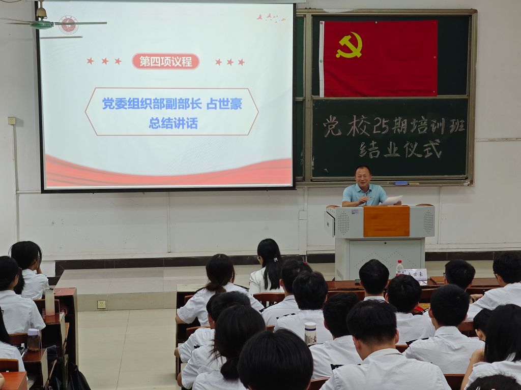 占世豪对学员顺利结业表示热烈祝贺。他指出,培训班课程安排紧凑高效,学员学习热情饱满,取得了理想成效。同时,他向学员提出三点期望:一是持续深化理论学习,夯实信仰之基;二是坚守入党初心,锤炼过硬政治品格;三是坚持知行合一,勇做时代先锋,将专业知识转化为强国建设的实际行动,在民族复兴征程中展现青春担当。
