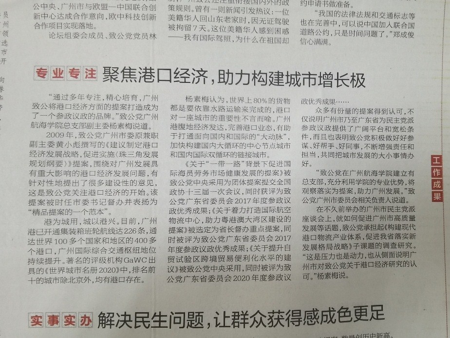 (党委统战部供稿)近日,我校致公党总支部主委、港口与航运管理学院副教授杨素梅接受南方日报记者采访,就广州港口经济发展相关问题进行交流。6月29日,南方日报以“专业专注——聚焦港口经济,助力构建城市增长极”为标题进行了专题报道。本次采访是广州市委统战部联合南方日报进行的专刊报道,是《献礼建党百年特刊——携手同心跟党走共创伟业谱新篇》中的一部分,专刊重点介绍广州统战工作的特色和经验,致公党广州市委员会的特色之一是持续关注广州港口发展,我校致公党总支部为此所做的工作也是最突出的。