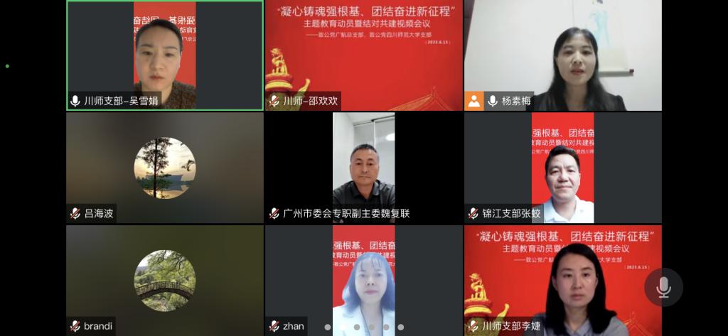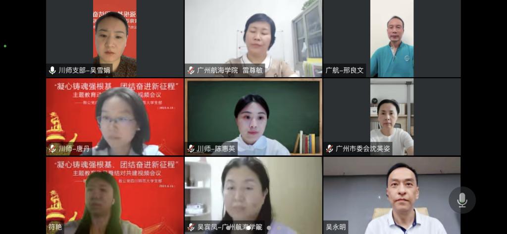 (党委统战部、致公党总支部供稿)6月15日晚上,我校致公党总支部与致公党四川师大支部联合召开“凝心铸魂强根基、团结奋进新征程”主题教育动员部署暨结对共建视频会议。党委组织统战部副部长雷尊敏出席。参加会议的领导和嘉宾还有四川师大党委常委、统战部部长唐文焱,致公党成都市委会专职副主委吕海波、副秘书长余夔、宣传处处长詹晓黎,组织处干部周正,侨海联络委员会执行主任、锦江区支部副主委张蛟,支部委员程静,致公党广州市委会专职副主委魏复联,秘书长兼组织宣传处处长沈英姿,办公室主任刘广英。我校致公党总支部及四川师大支部全体党员参加活动。