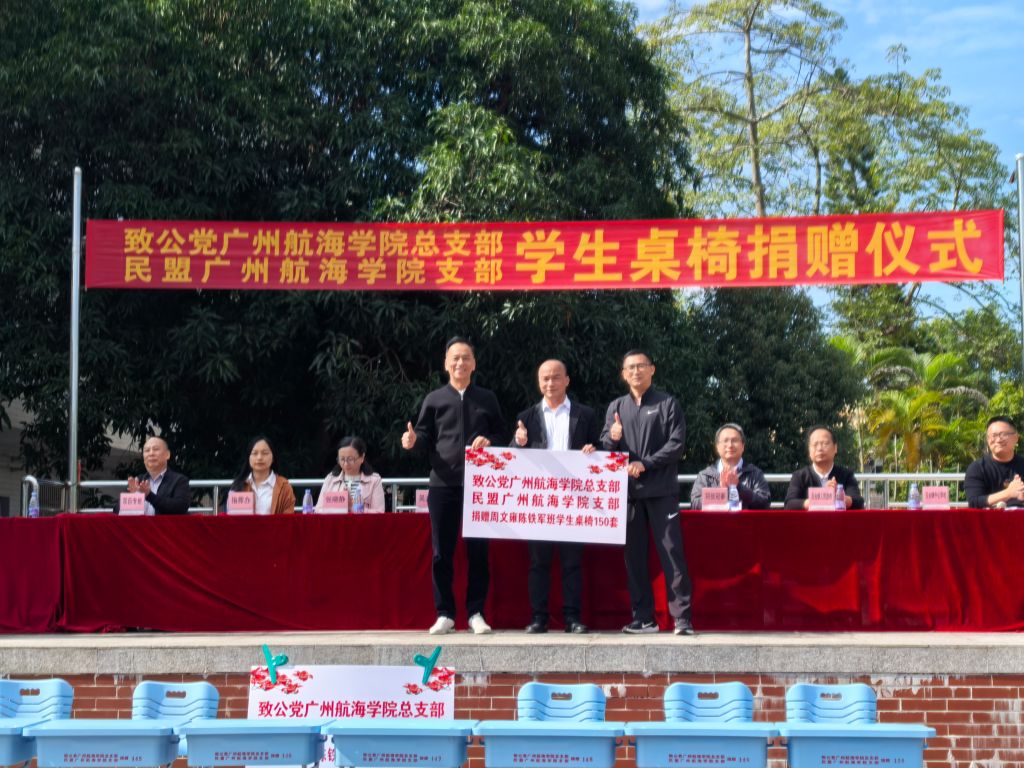 11月27日上午,开平百合中学举行了简朴而庄重的学生课桌椅捐赠仪式。民盟支部主委贺泽江、致公党总支部副主委吴永明代表各自组织向百合中学“周文雍陈铁军班”班级捐赠学生桌椅150套,并将剩余款项交至学校用于“周文雍陈铁军班”班级建设。百合中学校长关能立向两个民主党派组织颁发了捐赠证书并致以诚挚的感谢。