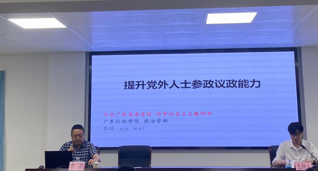 广东省委党校教授李鹏以《提高党外人士参政议政的能力》为题,依据新修订的《中国共产党统一战线工作条例》,从准确理解党外人士参政议政的内涵、科学把握党外人士参政议政特点、提高党外人士参政议政能力水平几个方面进行细致讲授,让参训的民主党派、党外知识分子加深了对习近平总书记关于做好新时代党的统一战线工作的重要思想的认识,增强了参政议政意识。