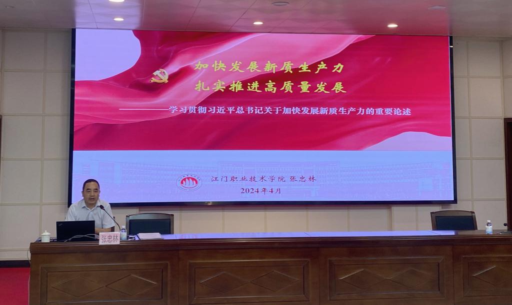 江门职业技术学院党委书记张忠林以《加快发展新质生产力,扎实推进高质量发展》为题,以华为、比亚迪、大疆等高科技公司为实例,深入浅出地解读了习近平总书记关于发展新质生产力的重要论述,让大家更加清晰地理解了加快发展新质生产力的重大意义,深刻认识了新质生产力基本内涵。