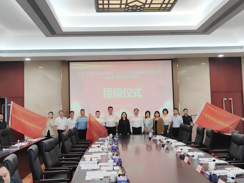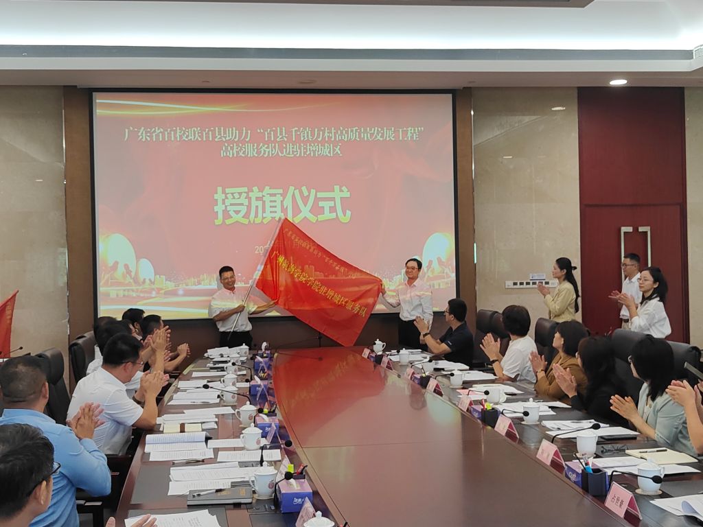 廖平还分别向3044am永利集团官网、广州体育职业技术学院、广州华商学院授予百校联百县助力“百千万工程”行动驻增城区服务队队旗。