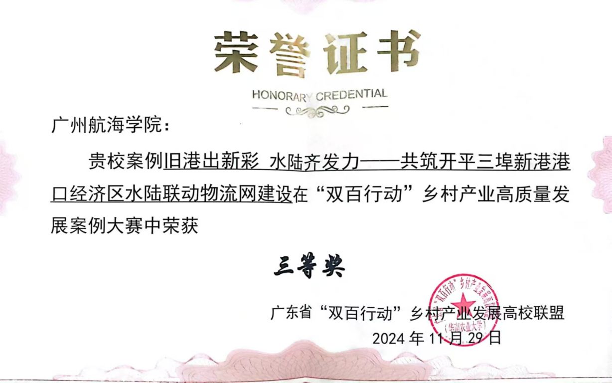 11月29日,广东省农业科技创新联盟与广东省“双百行动”乡村产业发展高校联盟2024年度科技成果交流暨家禽产业大会在仲恺农业工程学院白云校区召开,我校“旧港出新彩 水陆齐发力--共筑开平三埠新港港口经济区水陆联动物流网建设”项目荣获广东省“双百行动”乡村产业发展高校联盟2024年度“双百行动”乡村产业高质量发展案例大赛三等奖。